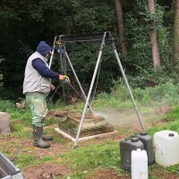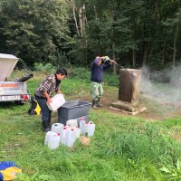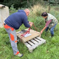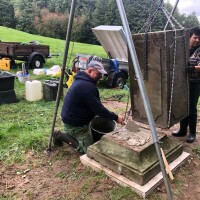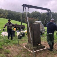 Dne 14. 9. 2023 se v 9.00 hod. na silnici z Tašova do Proboštova v místě křížení s vedením vysokého napětí sešli kameník Josef Sotona, jeho maminka, Jiří Esö z Pohoří a předseda spolku. Čtyřkolkou byl dolů k potoku svezen nejprve přívěsný vozík kameníka s vodou naplněnými kanystry pro čištění kamene tlakovou vodou a konstrukcí "čtyřnožky" pro manipulaci s patkou a dříkem podstavce. Dalším přívěsem byl k potoku dovezen ostatní potřebný materiál a vybavení: elektrocentrála, WAPka, lana, nářadí apod. Pomocí "čtyřnožky" byla nejdříve přesunuta a otočena patka, jejíž styčná plocha se základem byla již 10. 9. 2023 vydrhnuta kartáčem. Po nanesení lepidla byla patka usazena na základ z kamenů a betonu (viz výše). Potom byla tlakovou vodou očištěna její vrchní plocha. Následoval přesun, vztyčení a správné natočení dříku. Před jeho usazením bylo na styčnou plochu naneseno lepidlo. Po sesazení byly patka a dřík očištěny tlakovou vodou. Následně byla sestava štětkou napuštěna speciálním čističem SI a po půlhodině jeho působení znovu očištěna tlakovou vodou. Tento proces se opakoval ještě jednou. Práce skončily v 16.00 hod. vyvezením dvou přívěsů nahoru k silnici.