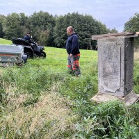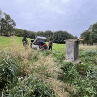 Téměř přesně po roce, dne 12. 9. 2024, se na stejném místě (křížení vedení vysokého napětí se silnicí spojující Tašov a Proboštov) v 17.15 hod. opět sešli kameník Josef Sotona s maminkou, Jiří Esö z Pohoří a předseda spolku. Kameník přivezl hlavici podstavce v přívěsu, který se připojil za čtyřkolku, aby Jiří Esö mohl hlavici převézt ke dříku s patkou.