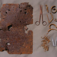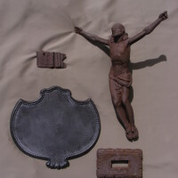 Dne 16. 4. 2024 Martin Šerák odkopal vrstvu zeminy kolem podstavce a při té příležitosti provedl průzkum detektorem kovů, zda se v blízkosti kříže nenacházejí jeho chybějící součásti. Mezi nálezy dominují zlomky hřebíků z rakví. Byly nalezeny i dva úlomky paprsčitých září (na snímku již otryskané), které ale k demontovanému kříži nepatří. Martin Šerák usuzuje jednak z historických souvislostí vzniku vsi (původní název Theresiendorf; k její historii více ZDE) a kostela, ale i z tvaru podstavce, polohy kříže poblíže vchodu a značnému navýšení terénu, že kříž, resp. hrob vznikl kolem první třetiny 19. století. Vznik hrobu tak opovídá období vzniku kříže Proboštov VII a Řetouň I.