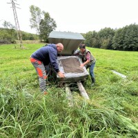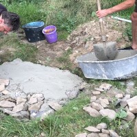 Ve dnech 11., 20. a 21. 8. 2023 byl postupně vybudován základ kříže spojením kamenů betonem CEMEX Profi B30. Pomocí čtyřkolky bylo od silnice k potoku (převýšení 30 m na 190 m trasy) převezeno celkem 525 kg betonu. Spolu s kameny tak základ tvoří blok o hmotnosti cca jedné tuny.