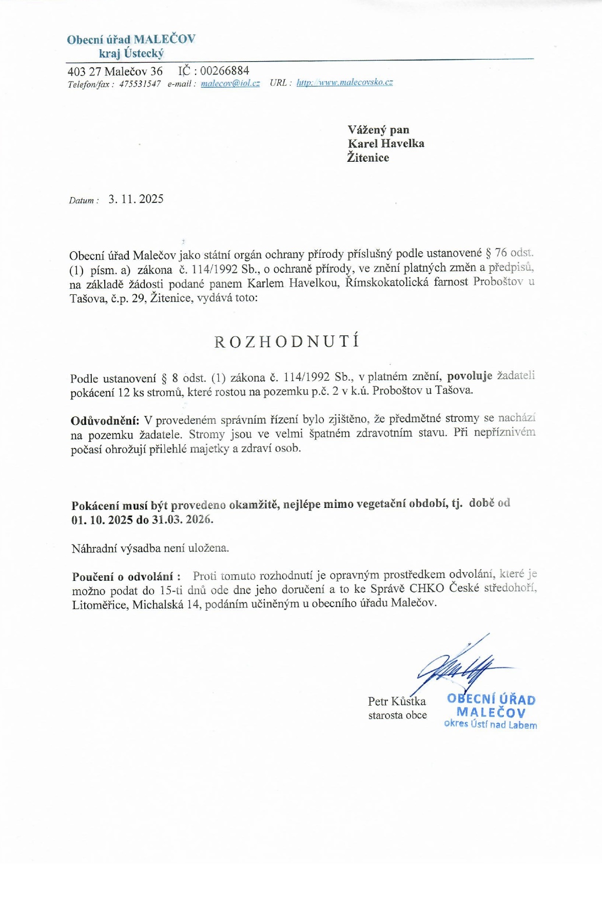 In the summer of 2025, the administrator of the Roman Catholic parish of Proboštov, Dean Karel Havelka, agreed with Tomáš Jelínek, who takes care of the area around the church, that trees would be felled and bushes removed in the northern part of the cemetery. The Malečovský rozhled association is also interested in clearing the cemetery after documenting it. On October 20, 2025, the chairman of the association met with Tomáš Jelínek at the cemetery to agree on the scope of work and, in particular, the selection of trees to be felled. After the inspection, it was concluded that all mature conifers (fir, spruce, larch) pose a threat to the church bInuilding, especially its roof, due to their height and the possibility of falling. Since all the trees in question have a trunk circumference of more than 80 cm at a height of 130 cm above the ground, the association will submit a request for their felling to the relevant institution, in this case the municipality of Malečov.