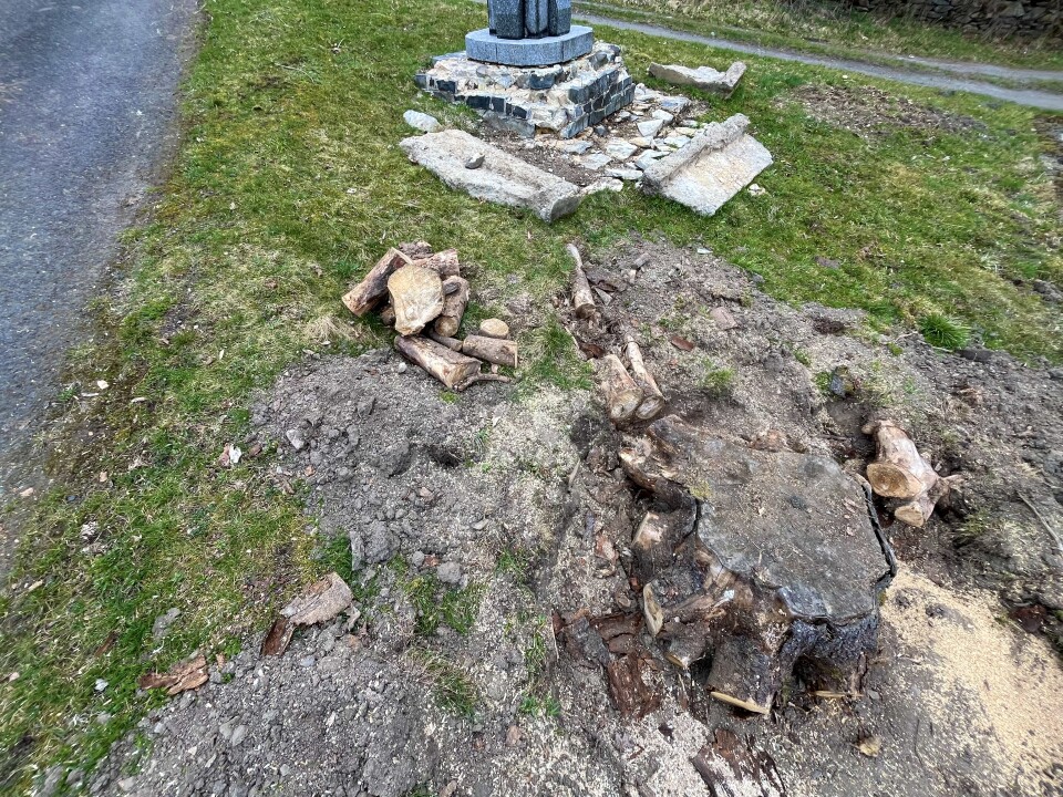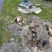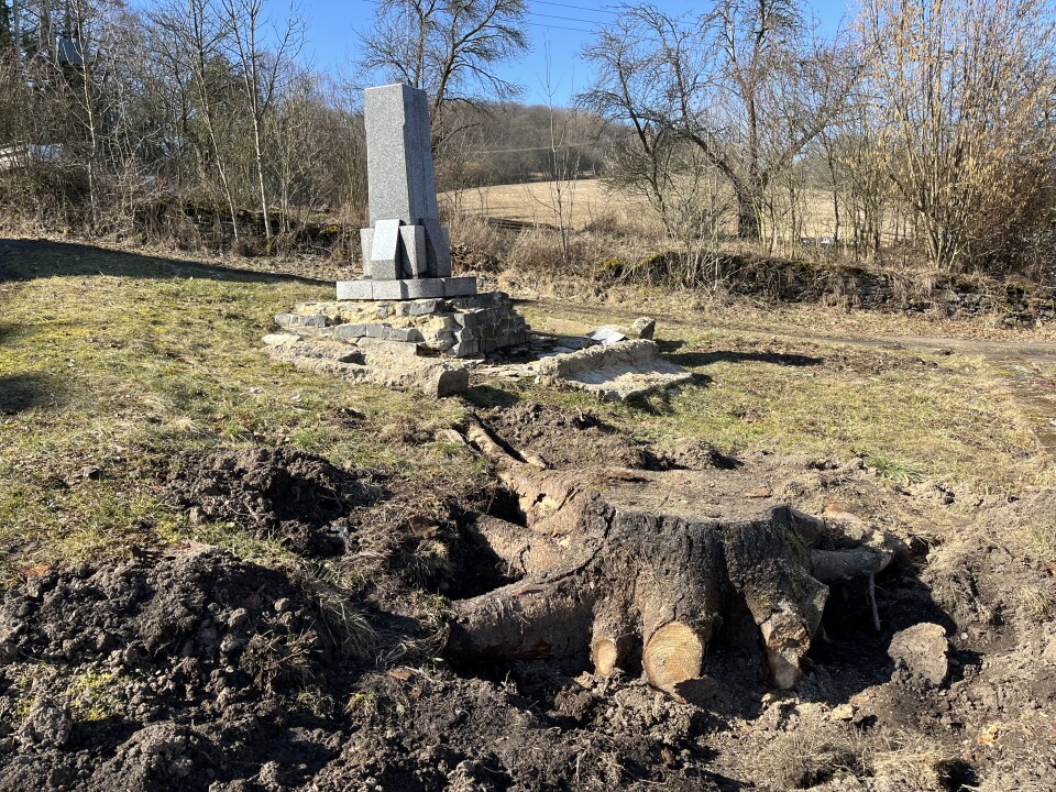 Tomáš Jelínek, který pomáhal při odstraňování rozpukaných betonových bloků kolem pomníku (viz fotogalerie z 27. 10. 2025), zjara roku 2026 začal pracovat na přeřezávání kořenů.